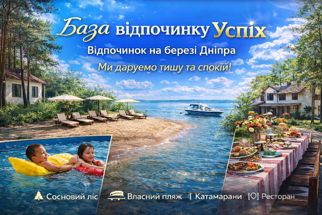 Влітку заміський комплекс Успіх пропонує Вам прогулянки у сосновому лісі на велосипедах, прогулянки по Дніпру на катамаранах, відпочинок на обладнаному шезлонгами та парасольками піщаному пляжі, басейн , риболовля на Дніпрі на судака, щуку, сома, коропа, карася, риболовля на ставках , майстер-класи з приготування страв української кухні та багато іншого для вашого повноцінного відпочинку.